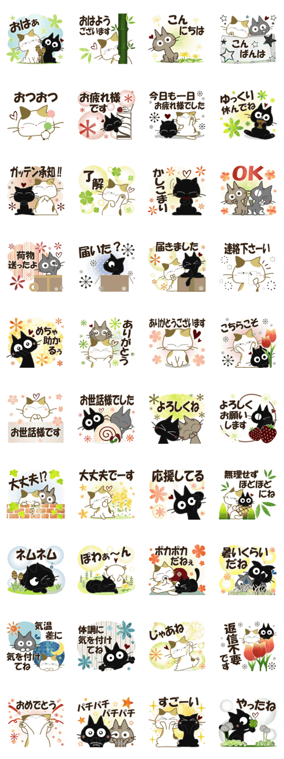 黒ねこちゃん達とみけさんのコラボスタンプ5つ目!春の日常スタンプです♪