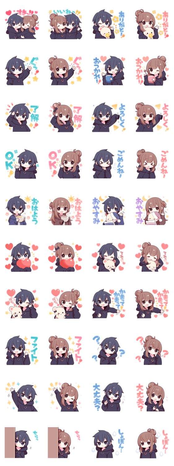 友達やカップル、家族といっしょに使えるペアスタンプです。毎日使える挨拶やリアクション、伝えたい言葉が沢山入っています。2キャラ入ったお得なセットとしても是非♪