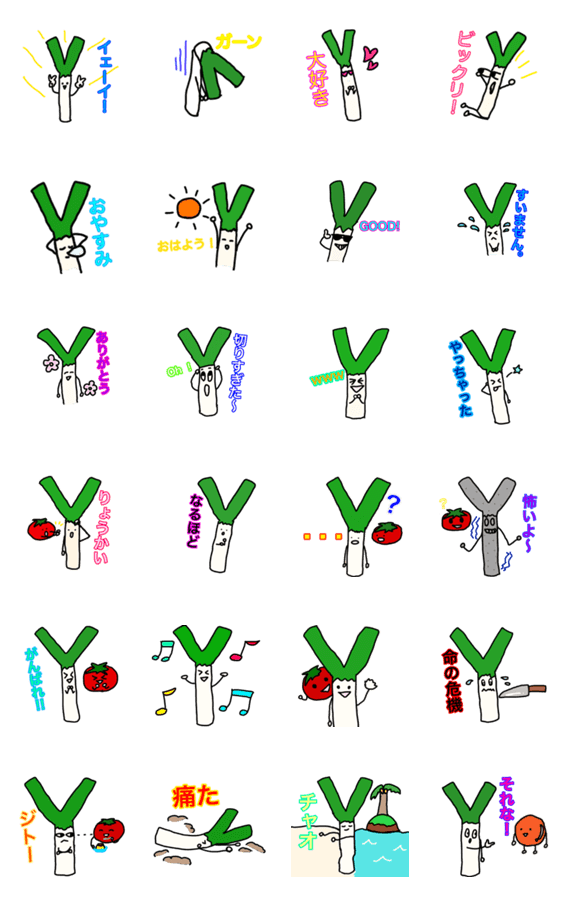 | スタンプ説明 | ネギが大好きな小学生が作ったスタンプです。 かわいいネギやトマトなどのキャラクターが会話を盛り上げてくれます。 ポップな絵で気分が高まります。 |