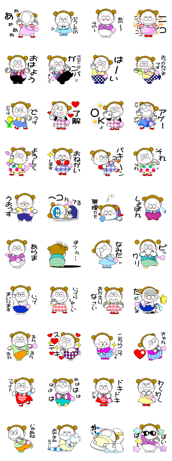 2つのお団子髪の明るく元気な女性の毎日楽しく使えるスタンプです。