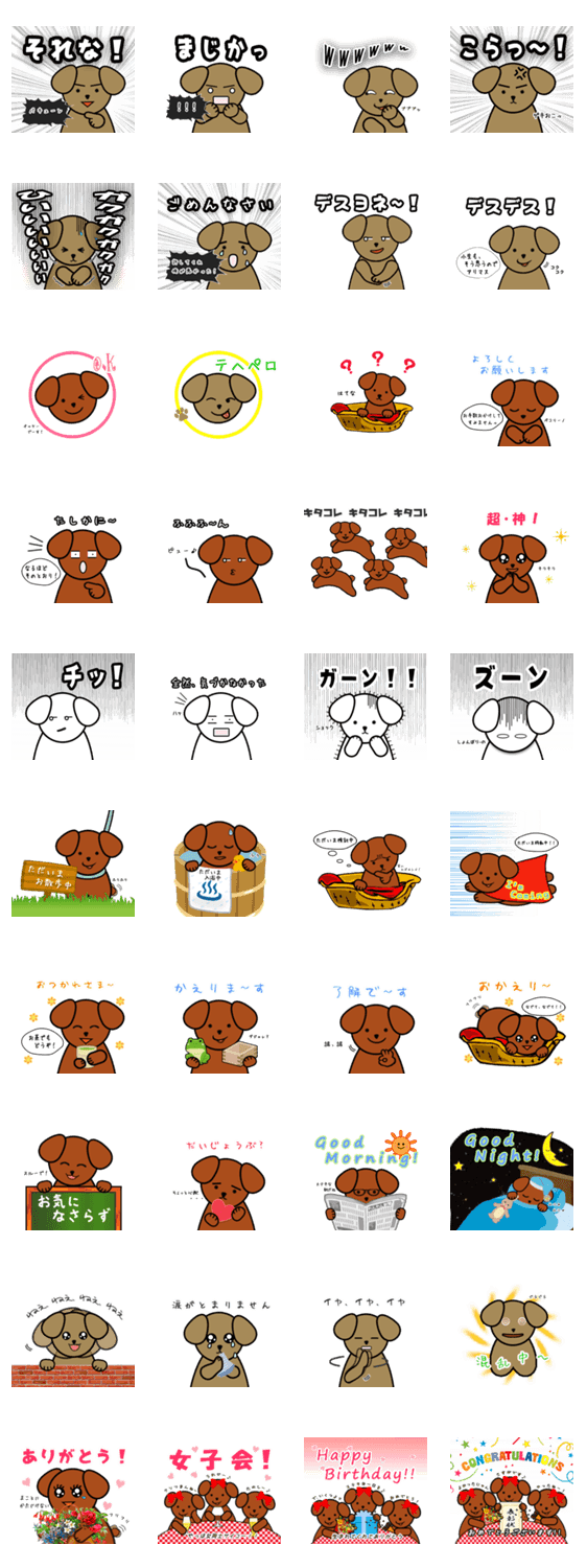 のんびり屋なのに、たまに激昂する犬、タルタルの日常を彩るスタンプ。使いやすいように文字を大きめにしました。犬好きな人にぜひ使って欲しいです。