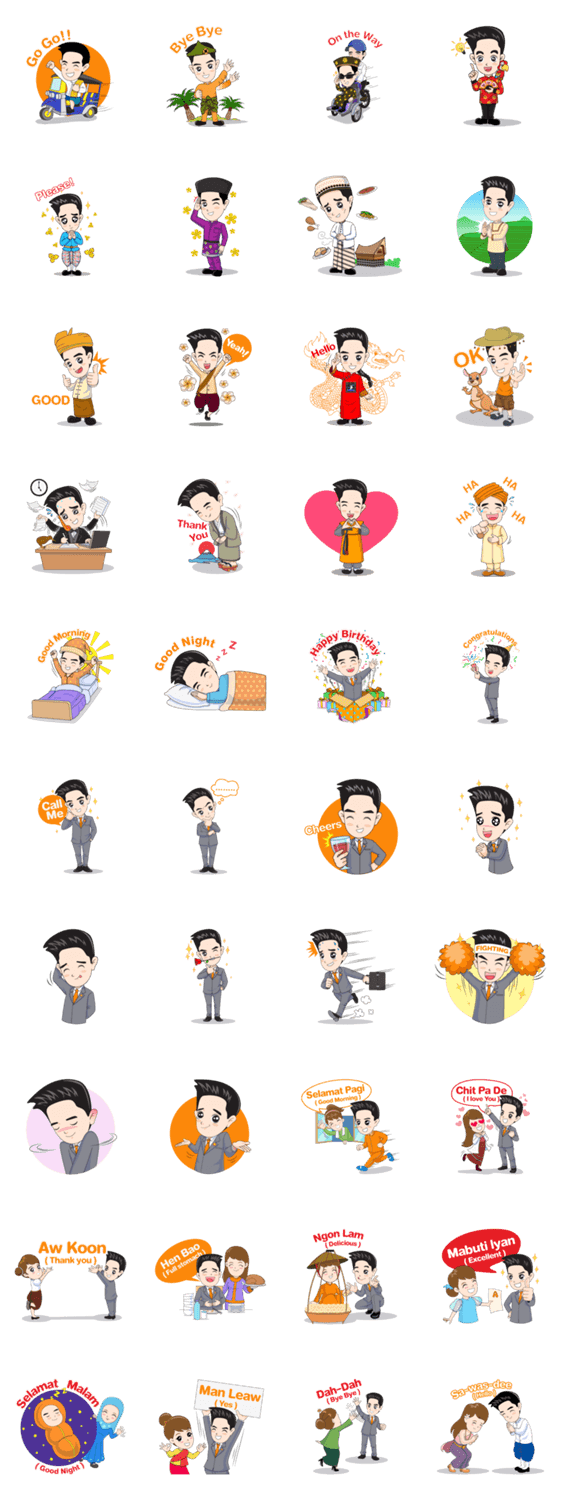 | スタンプ説明 | Follow "Mr.AEC", Kasemsant Weerakun, around ASEAN and ASEAN + 6 for fun-filled knowledge. Chat & share with our cool, specially-designed stickers. Download Now! |