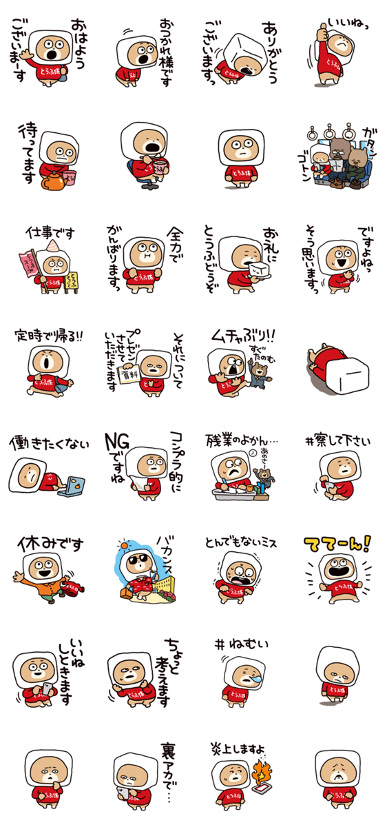 | スタンプ説明 | 日清カップスープの公式キャラクターとして、とうふをかぶって活動中。 活動の様子をTwitterでお知らせする係をしています。 |