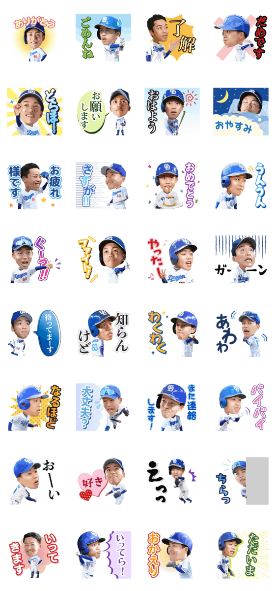 | スタンプ説明 | 2022年最多安打、ベストナイン、ゴールデングラブ賞の岡林選手がスタンプになって登場! 未来を担う若竜戦士スタンプで盛り上げていこう! どらほー!All for Victory! |
