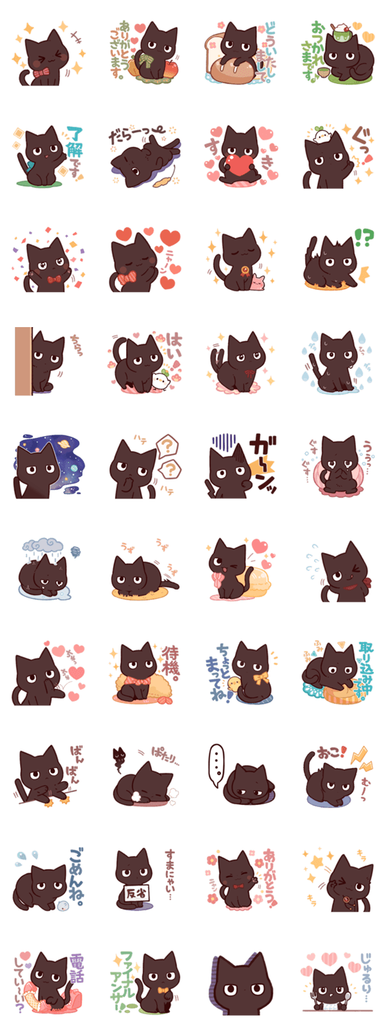 まっくろなねこさんの毎日使えるちょっと丁寧なスタンプです。日常会話やリアクション、あいさつの言葉が入っています。お友達や家族、恋人との会話にも是非。
