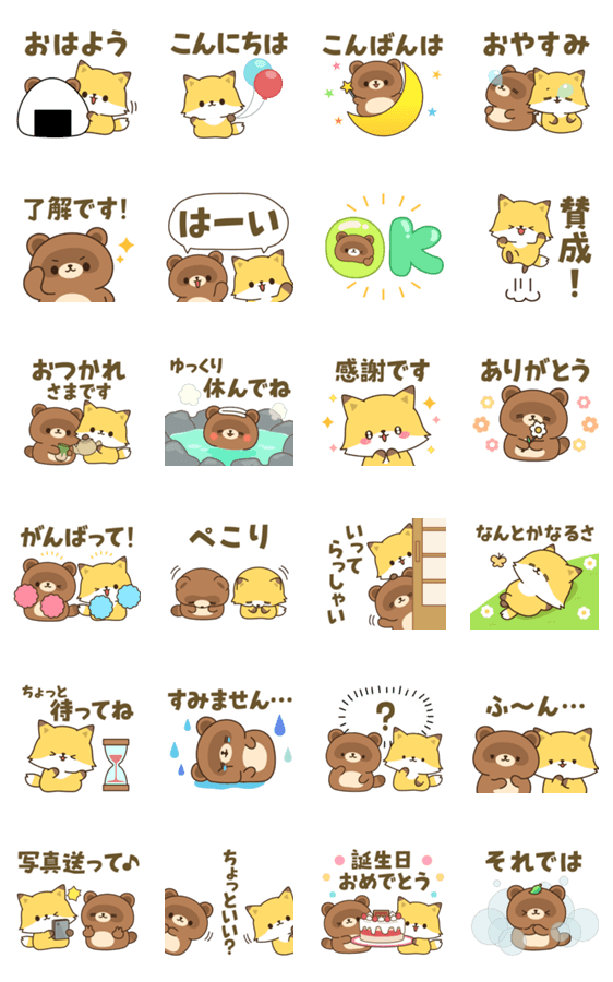 日常で使いやすい言葉が揃った、たぬきときつねの飛びだすスタンプです♪