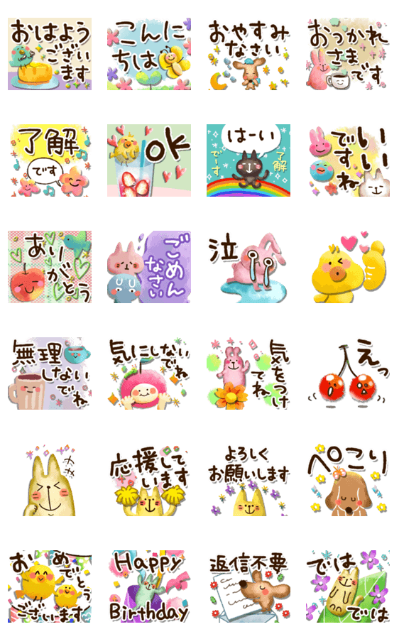 | スタンプ説明 | 癒し系ふんわりスタンプ。敬語/猫/ねこ/うさぎ/犬/鳥/ひよこ/デカ文字/基本/挨拶/動く/家族/丁寧/かわいい/山田まぽん作。 |