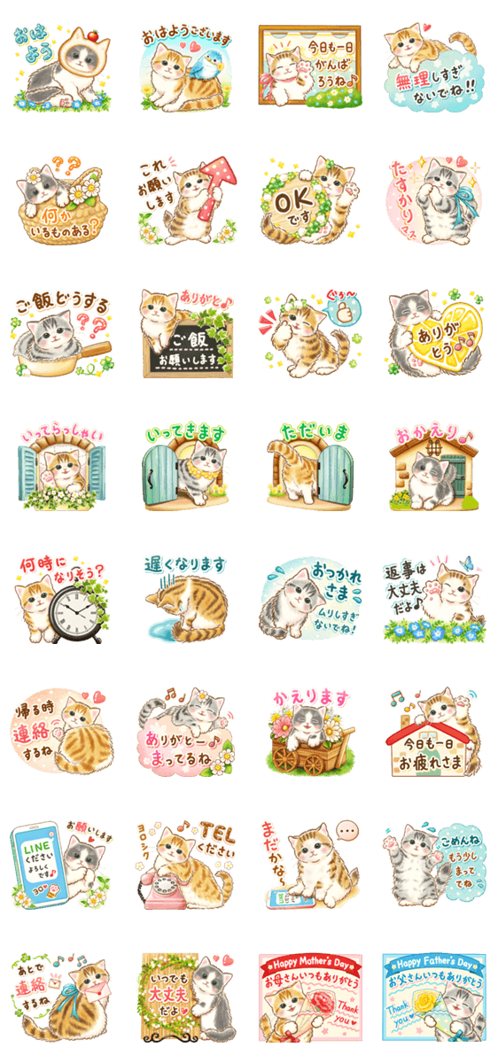 もふもふちっちゃい猫たちのスタンプです♪ 家族での連絡のやり取りに使いやすい言葉を詰め込みました♫仲良しなお友達との連絡や、母の日と父の日の感謝のメッセージにも♡