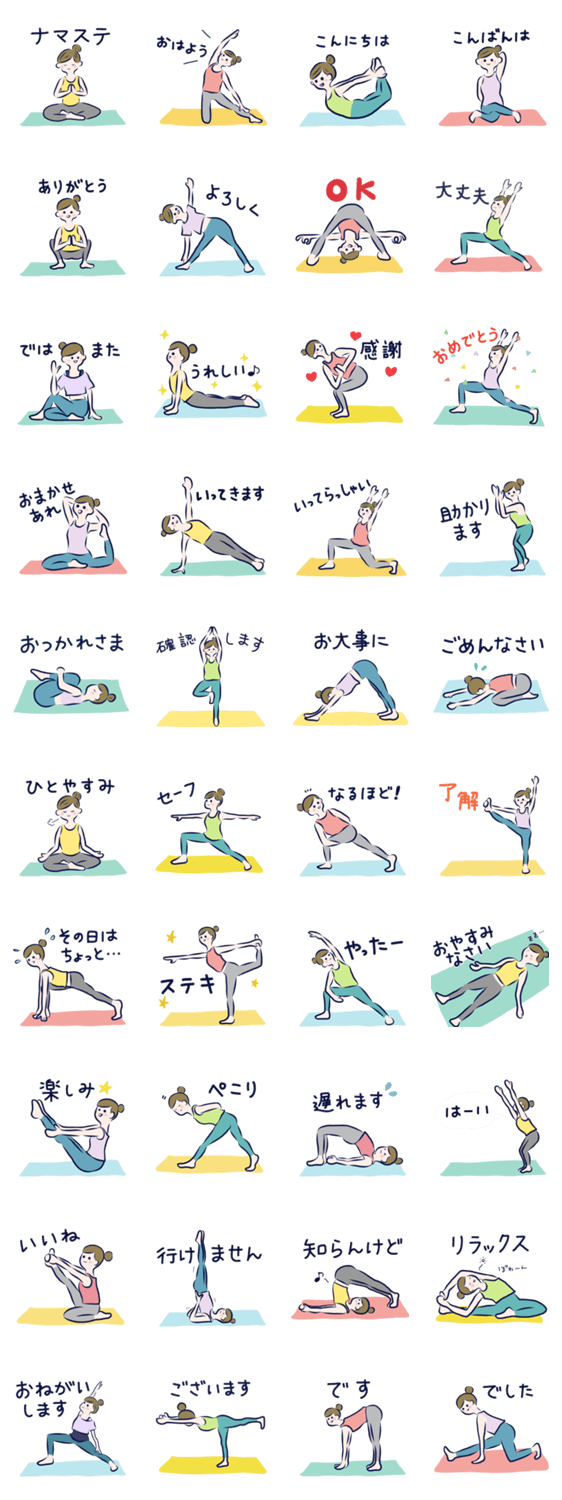 ヨガのポーズで日常会話やあいさつができるスタンプ。カジュアルな会話にも「です」や「ございます」と合わせて敬語丁寧語にも。ヨガ友達はもちろんヨガ友以外にもどうぞ。