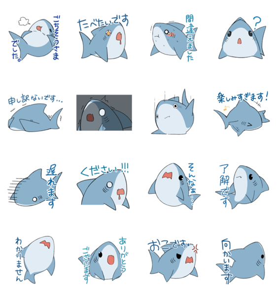 食べたものに変身するサメ『れおなるど』のスタンプ第3弾! 今回は変身しませんが、目上の方にも使える敬語スタンプになっています。
