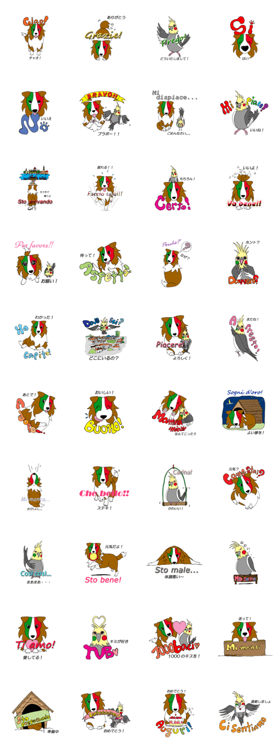 イタリア人とも会話ができる、トリコローレのシェルティ犬とオカメインコのLINEスタンプ。使っているうちに、日本人はイタリア語をイタリア人は日本語を覚えられちゃうよ!