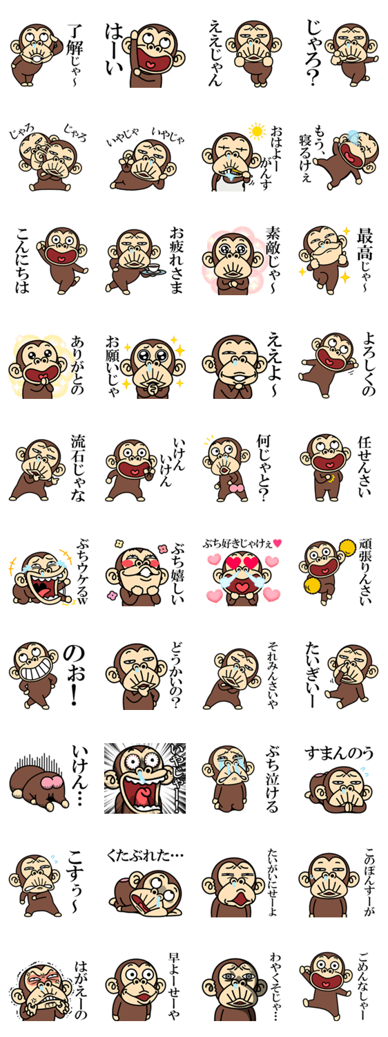 イラッとお猿さんのよく使う【広島弁】を集めた便利なスタンプセットじゃ。