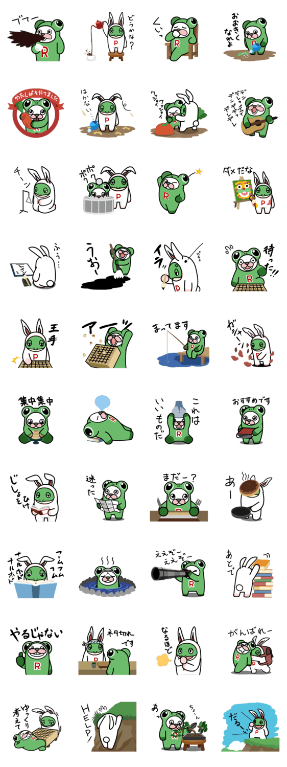 | スタンプ説明 | ウサギの着ぐるみを身につけたカエルもどきの「ピク」と、カエルの着ぐるみを身につけたウサギもどきの「レス」、この奇妙な生物2匹がトークをサポートします! |