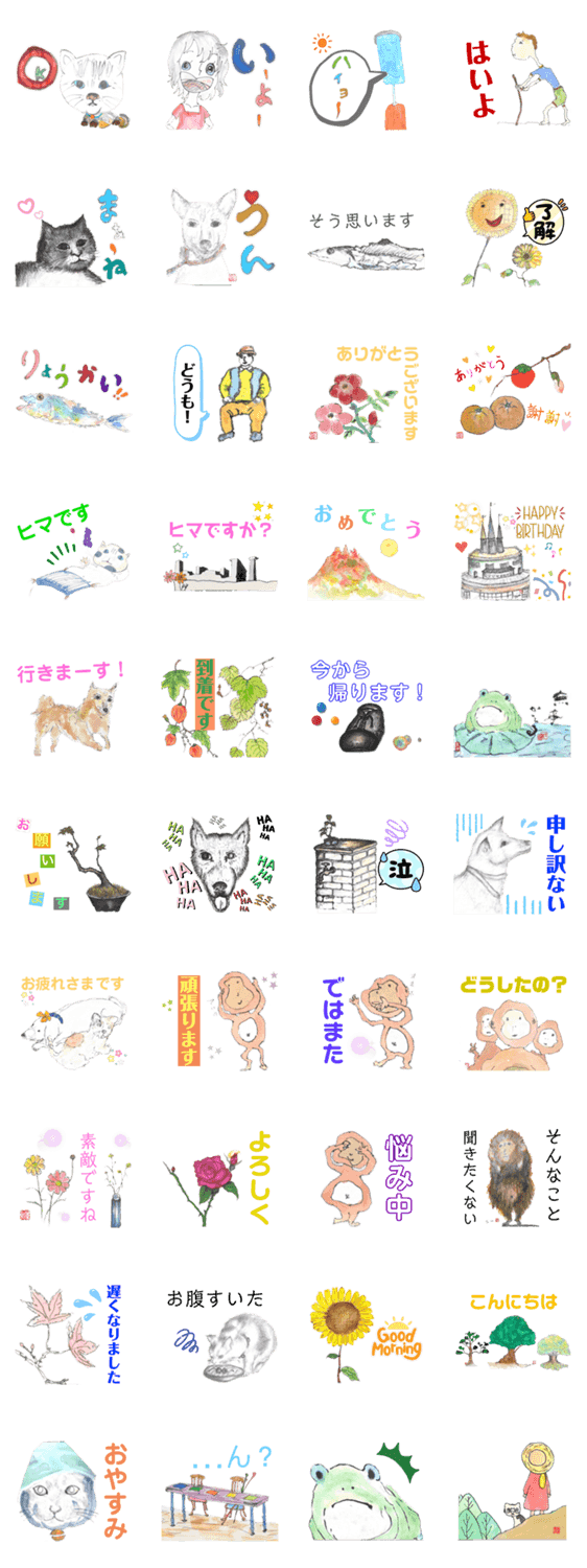 ほっこりする手描きイラストです。色鉛筆や水彩で描きました。ネコ、猿、お花、景色など。文字は大きめにして日常に使いやすいように、見やすいようにしました!