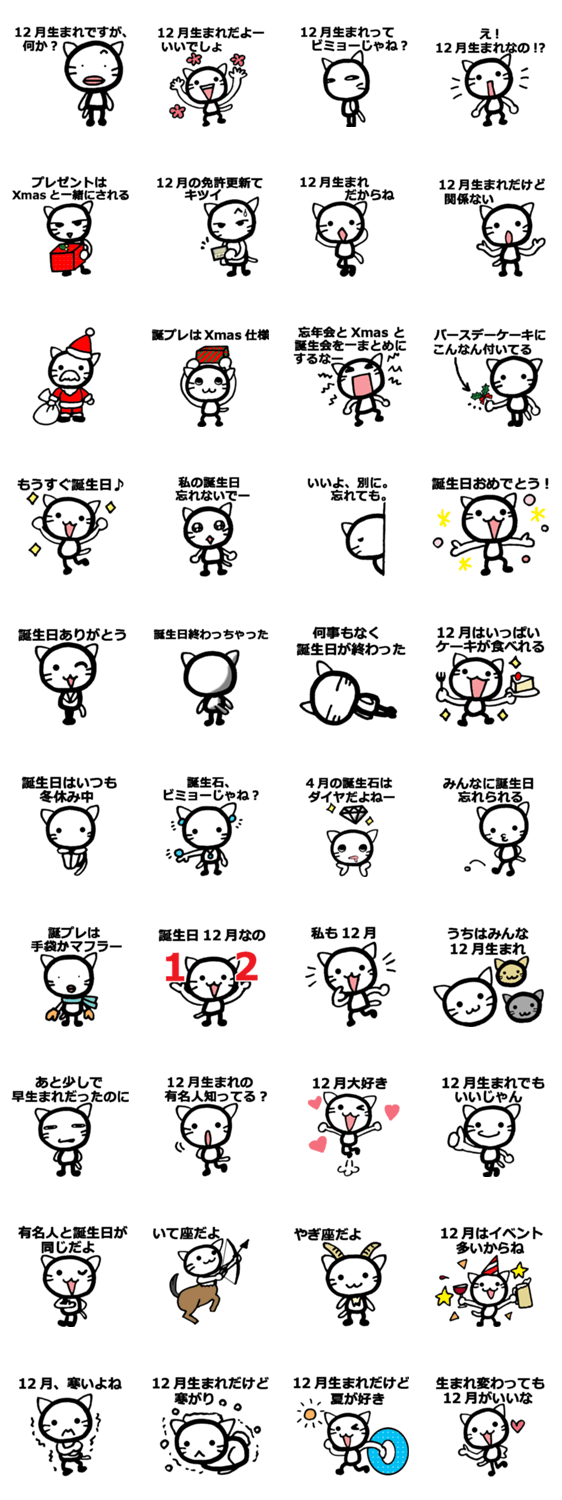 誕生日が12月の人用スタンプ。12月生まれの悲哀(?)、喜びが満載。12月生まれでなくてもシャレで使ってください。猫好きの人も。プレゼントしても楽しいよ。