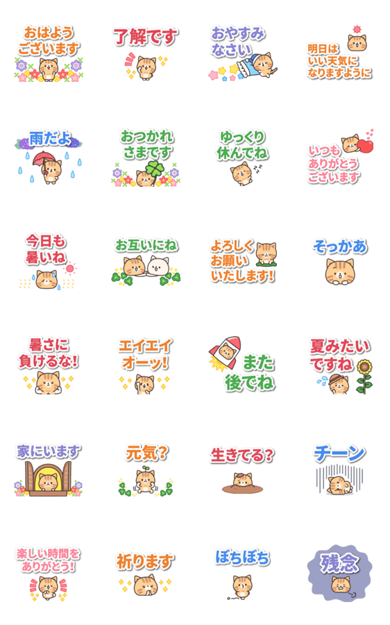 相手を気遣う言葉がいっぱいの毎日使える優しいトラネコさんのとびだすスタンプだよ♪大きな文字で読みやすい!