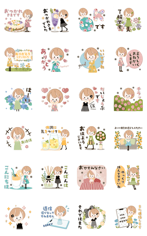 爽やかな初夏の季節にぴったりな大人の女性が使いやすいスタンプです。可愛いワンピースコーデが華を添える、敬語多めのセットです。