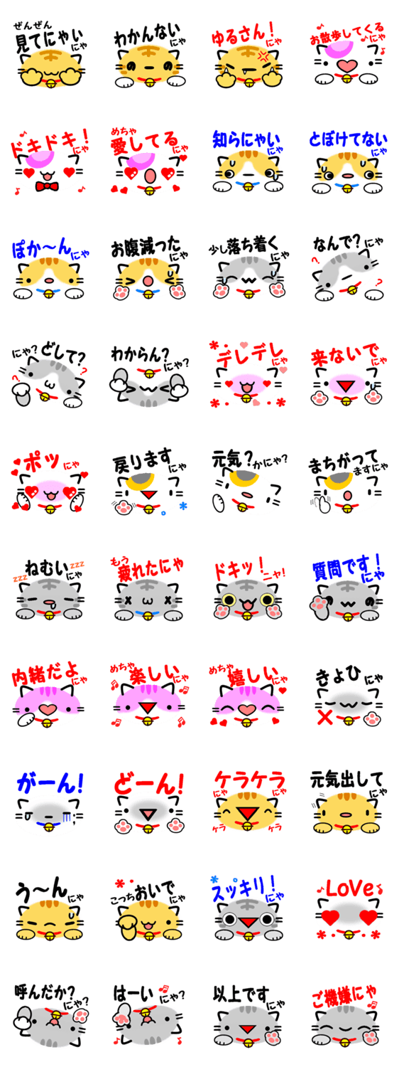 いろんな種類の可愛いねこ達の顔文字風スタンプ2です。日常で使える言葉をスタンプにしてみました。 今回また種類を増やしました。