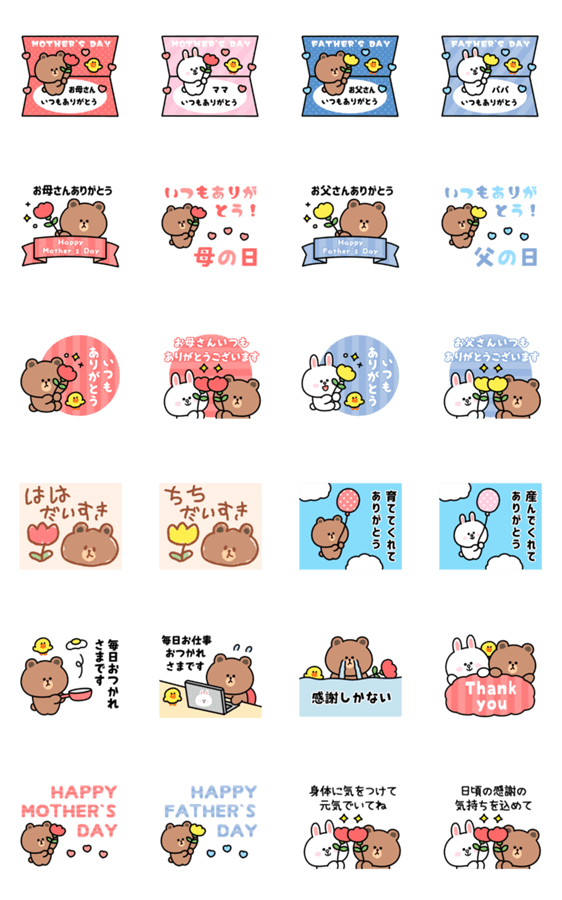 日頃の感謝の気持ちを送りましょう。お母さん/お父さん/ありがとう/おかあさん/おとうさん/ママ/パパ/母親/父親/母ちゃん/父ちゃん/ばあば/じいじ/カーネーション/薔薇 ※BROWN & FRIENDS をみんなでつくろう!キャンペーン参加スタンプです