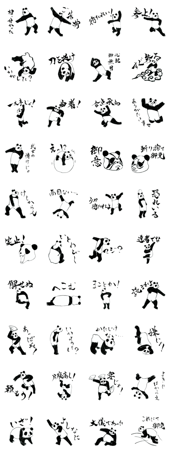 | スタンプ説明 | 江戸時代に生息していたと思われる知能の高いパンダ。なぜか侍の言葉を使う。 |