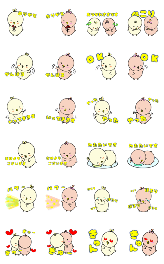 男の子のぴーと、女の子のちー。いつも仲良しなひよこさんのスタンプです。