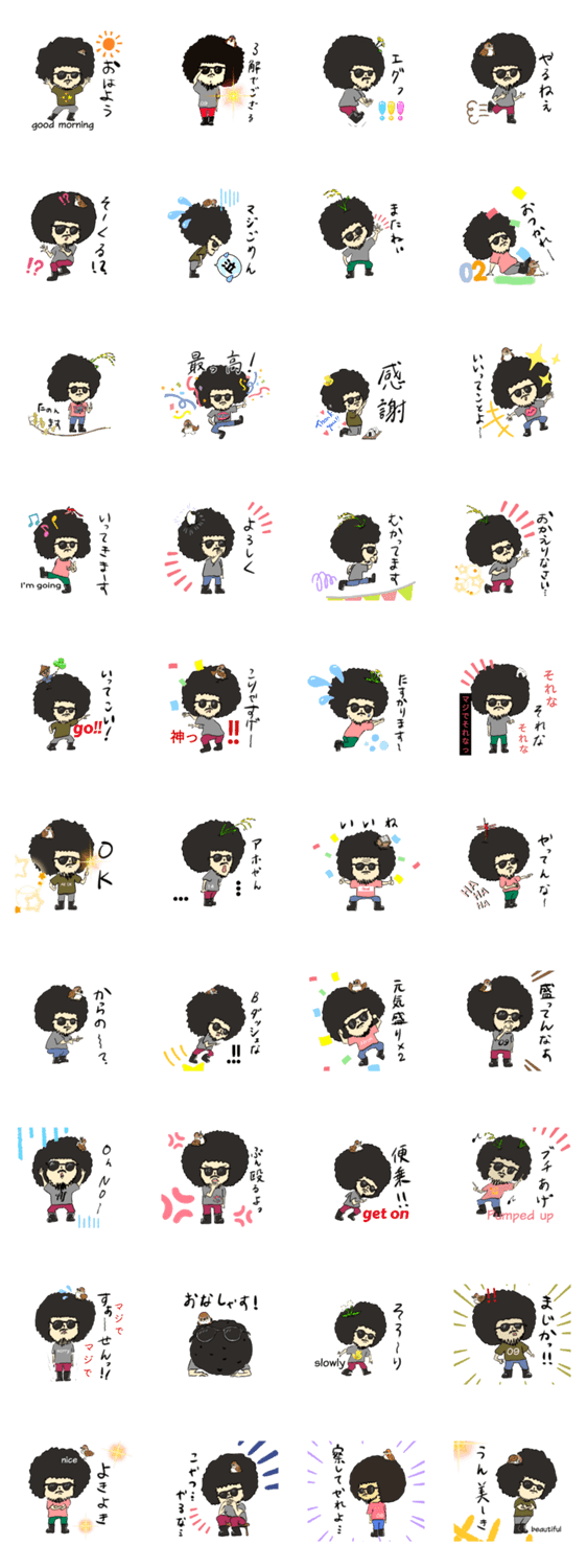 | スタンプ説明 | アフロヘアーにサングラス、長靴を履いて、いつものスタイルで。 |