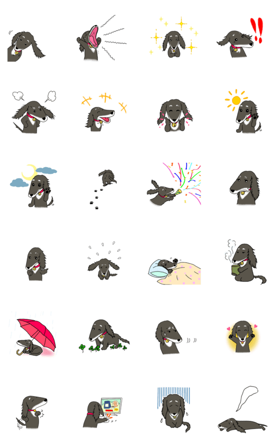 ミニチュアダックスのスタンプです。(モデルとなった犬は、むぎという名前で、耳が聞こえなかったので、首に鈴をつけていました)