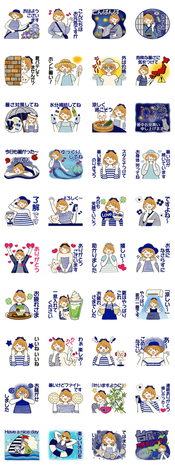 涼しげなブルーボーダーコーデのリボンちゃんの夏スタンプです。暑い季節が少しでも爽やかに過ごせますように。 夏/日常/挨拶/猛暑/気遣い/爽やか/敬語入り