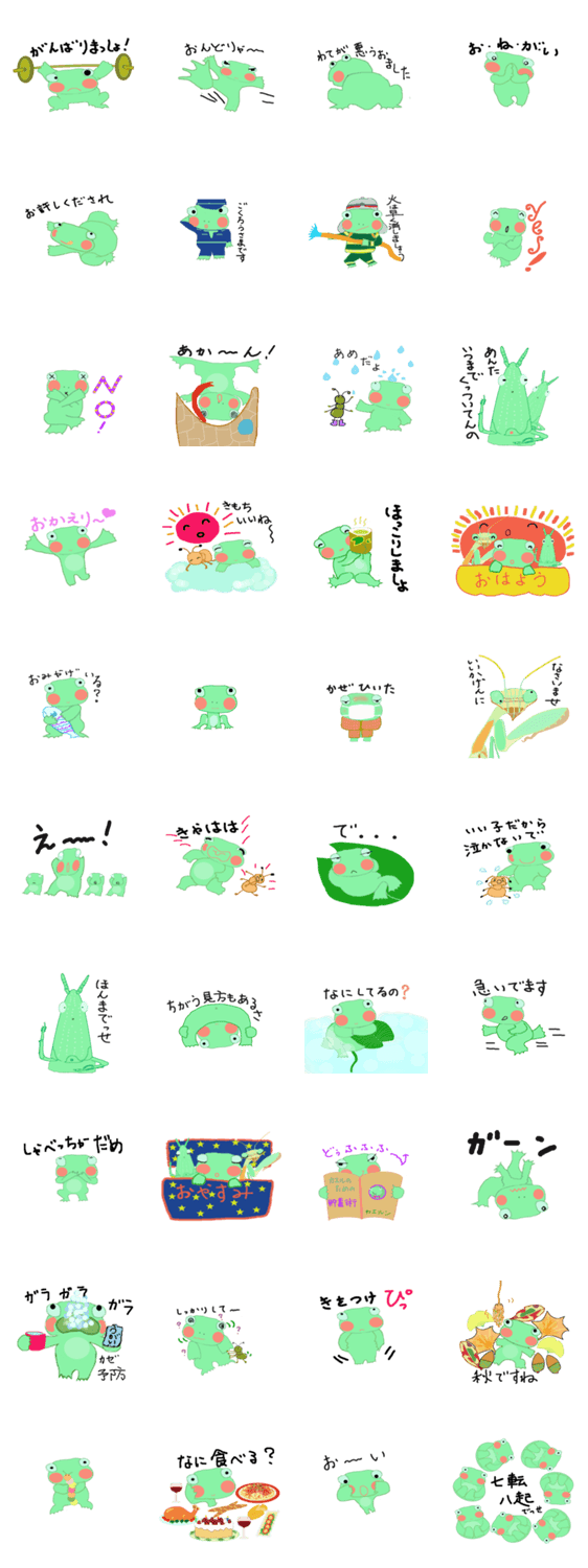 庭にいるかえるさんと虫たち、観察するとそのユニークさにおもわず笑ってしまいます。そのかわいさをスタンプにしてみました。