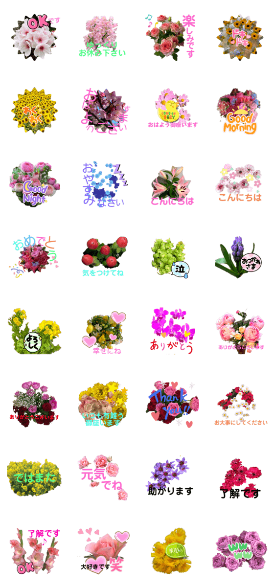 大切な人に送る花束の様なスタンプです。文字が大きめですので、選びやすくなっています。様々な場面で使える様に丁寧な言葉にしました。
