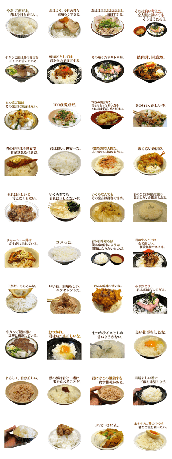 相手のすべてを肯定するご飯、どんぶり物のスタンプです。肯定は最強のコミュニケーション。丼、カツ丼、ふりかけ、ネギトロ、卵、牛タン、焼肉、チャーシュー、実写食べ物