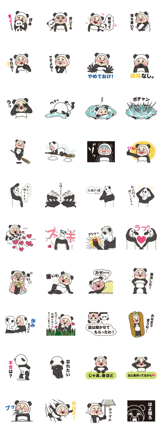 パンダの着ぐるみを着たおばさんがバージョンアップして帰ってきました!友達のパンちゃん(オス)と普段使えそうな言葉や使えない言葉を喋っているスタンプ第2段です。