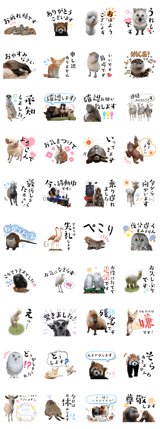 市川市動植物園のLINEスタンプ第2弾。目上の方にも使える敬語がたくさん!かわいい動物とミニSLも夢のコラボ♡ レッサーパンダ/ミーアキャット/カワウソ/アルパカ/タヌキ