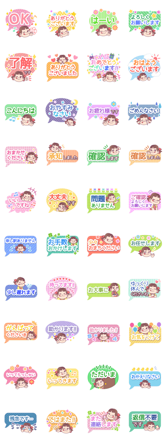 不二家の人気キャラクター「ペコちゃん」の敬語スタンプが登場☆かわいいふきだしデザインで、挨拶やお返事に使えるよ♪