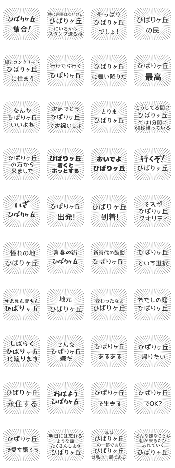 東京を舞台にした漫画風セリフスタンプ。集中線で叫べ。地元の人にも憧れてる人にも。面白いのが見つかると嬉しい。集中線。地元愛。ひばりが丘。