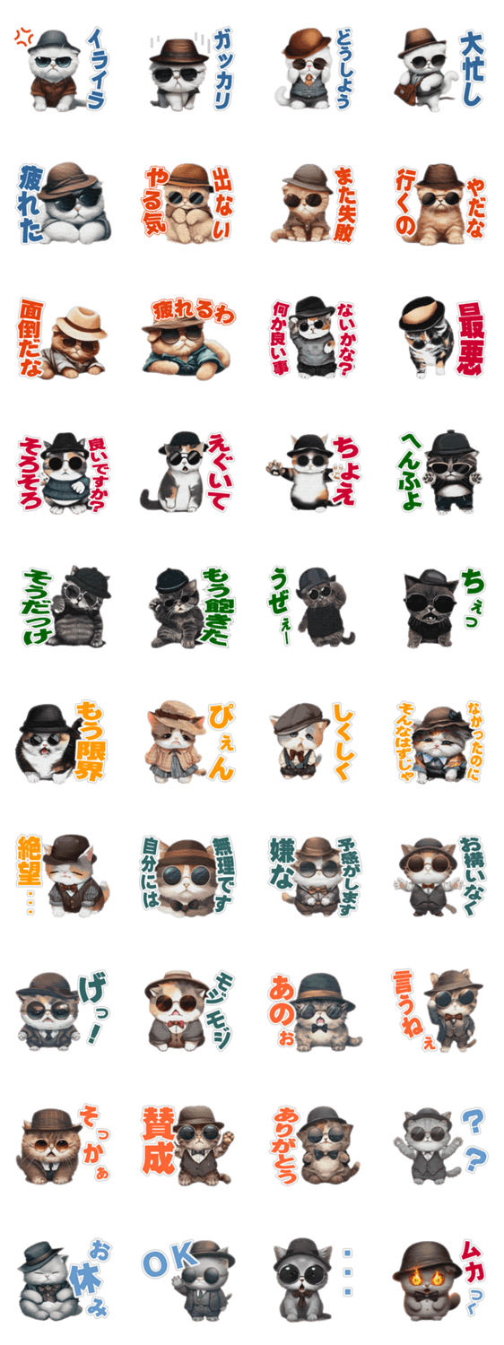 スーツを身にまとい、サングラスで隠された猫たちが、絶望に満ちた日常を描くLINEスタンプ。ネガティブな表情と状況を通じて、哀愁と孤独を共有しよう。