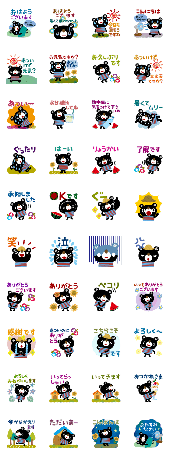 (黒背景にも使える白フチつき) ブラクマの夏スタンプ、静止画バージョンです。 おはよう、ありがとう、よろしくなど毎日使えるフレーズがイッパイ。