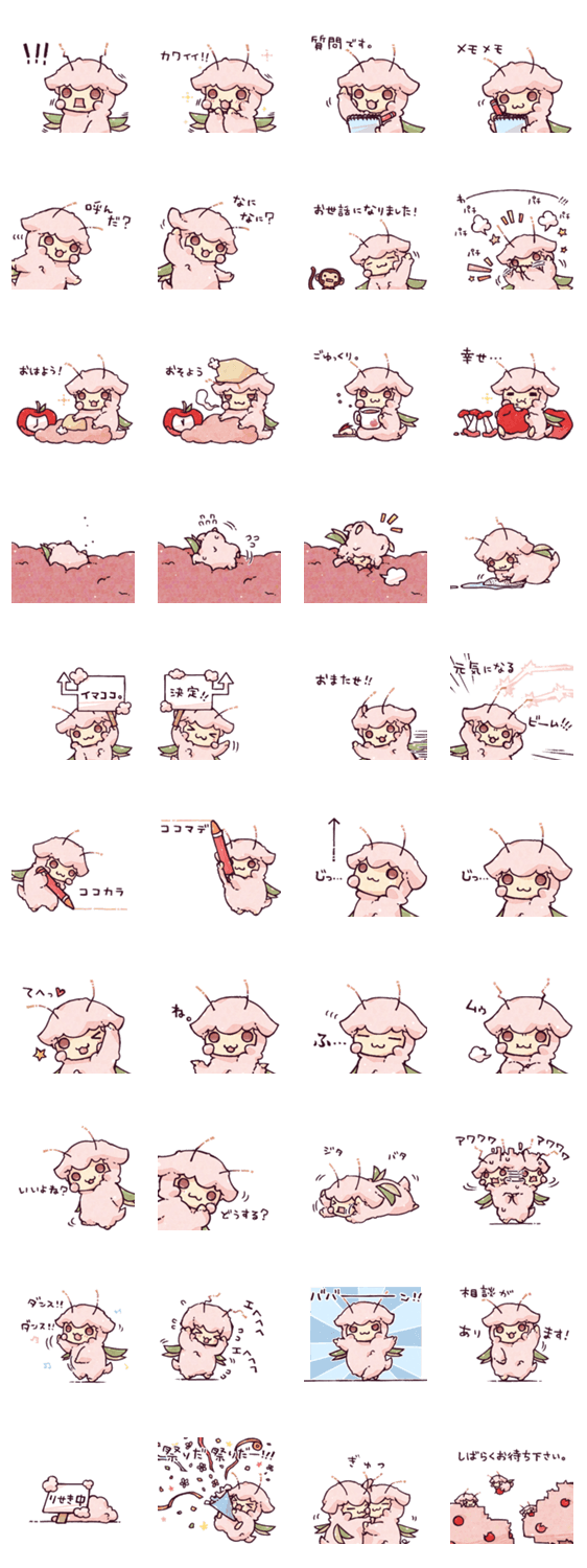 | スタンプ説明 | ピンクのもふもふに翅(はね)と触覚がついたキャラクター"羊セミ"のスタンプ【第三弾】です。 |