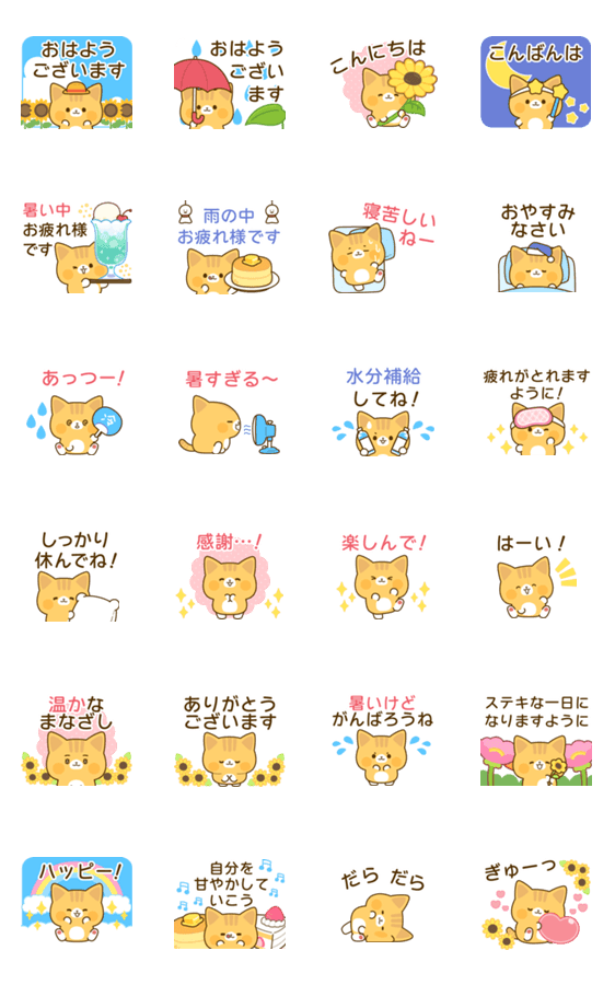 茶トラ猫の夏の言葉多め、相手を労う言葉が多めの飛び出して動く優しい敬語スタンプです♪