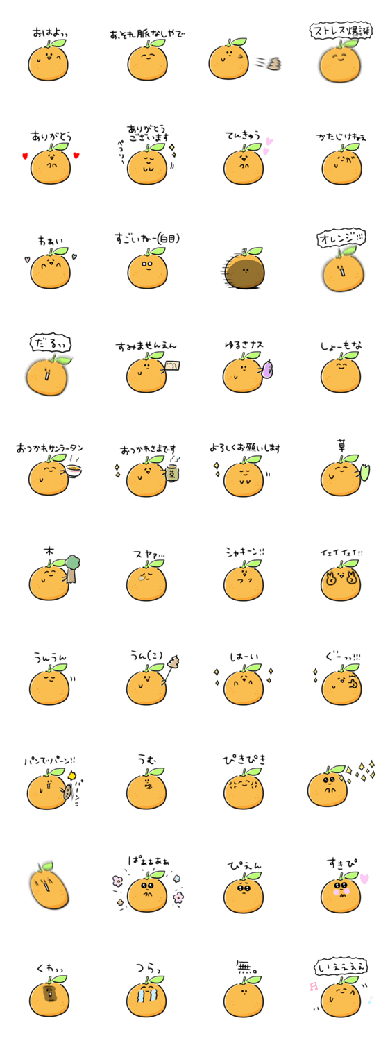 おれんじのシンプルで使いやすいスタンプです。[ゆるかわ シュール 可愛い 食べ物 敬語 ダジャレ 毒舌]