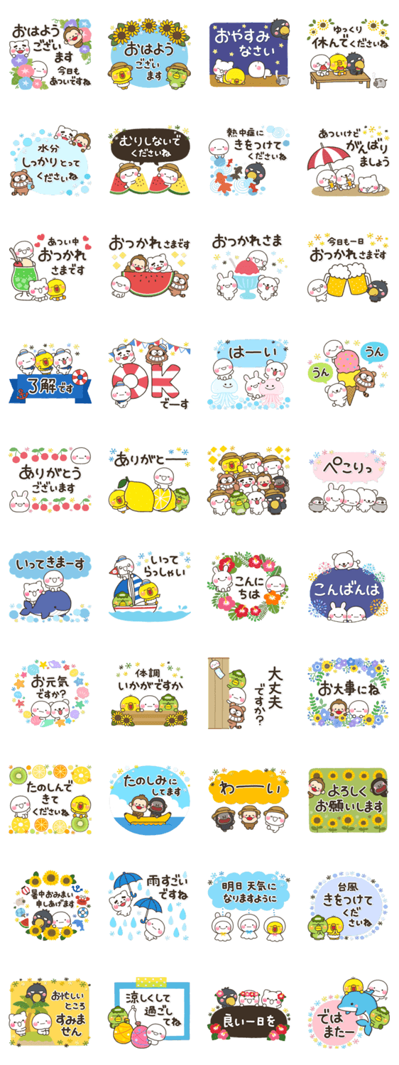 みんな大集合の特別な夏スタンプです。毎年使える内容を厳選し作成いたしました。【作:いしいともこ】