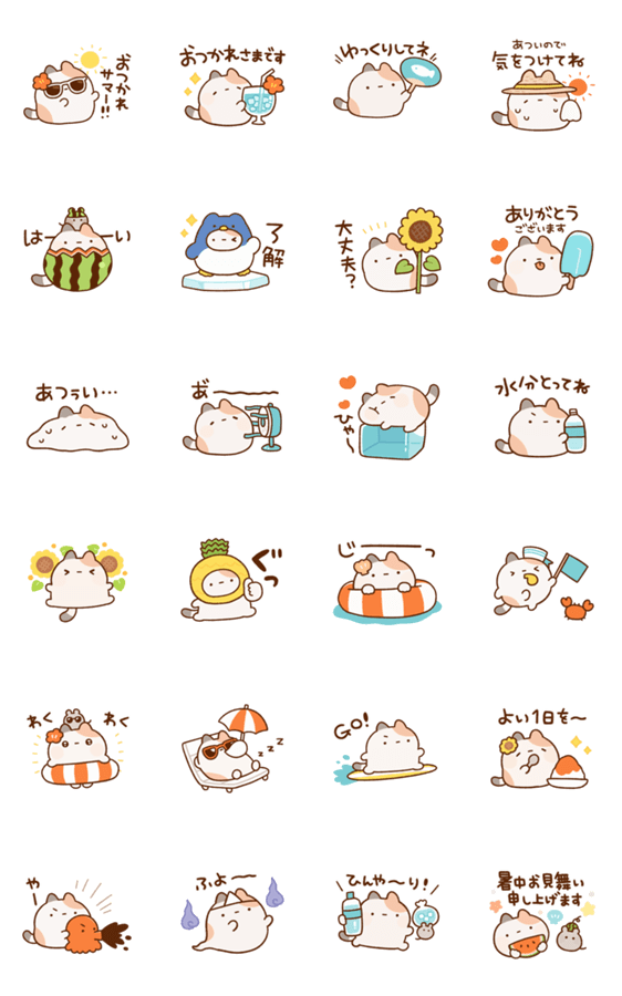 わがままボディな可愛い『ずんどうネコ』のアニメーションスタンプ第13弾!夏にぴったりなモチーフや気づかい言葉もたくさんあるよ♪