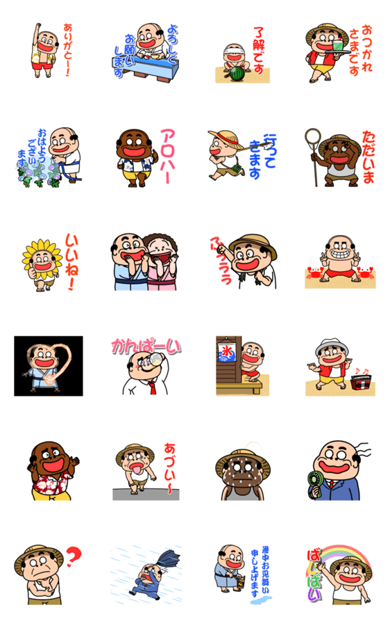 昭和のおじさん、夏用のアニメーションスタンプです!夏を楽しむ内容や、暑中見舞いスタンプ、夏っぽいスタンプの詰め合わせです!