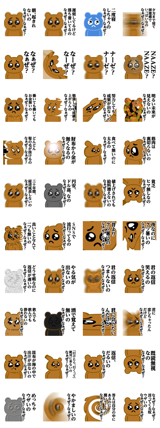 | スタンプ説明 | ぴえんMAX/熊/クマ/ベアー/ピエンクマ/なーぜなーぜ/なーぜ?なーぜ?/なぁぜなぁぜ/あおり/アオリ/挑発/喧嘩/恋人/若者/SNS/カオス/毒舌/煽り/ネガティブ/流行語 |