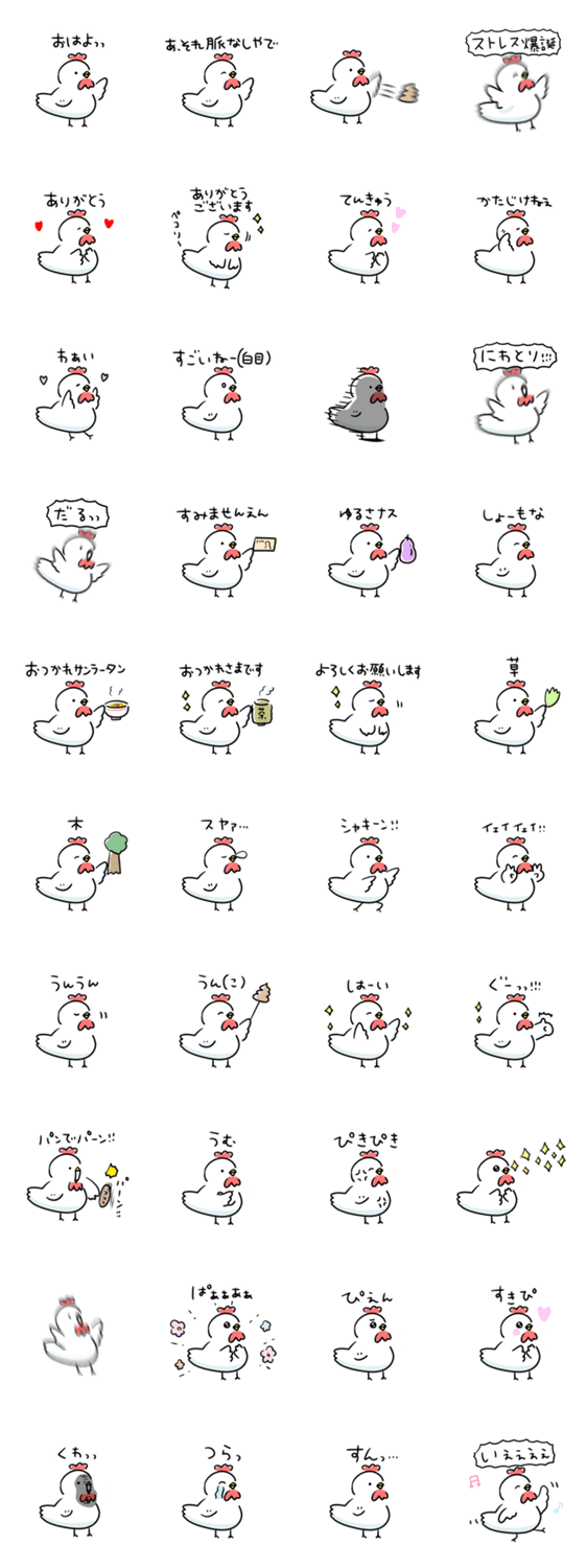 ニワトリのシンプルで使いやすいスタンプです。[ゆるかわ シュール 可愛い 食べ物 敬語 ダジャレ 毒舌 鳥 トリ 動物 どうぶつ]