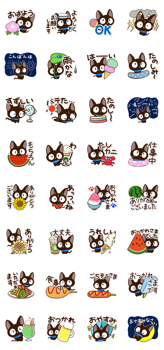 『やさしいクロネコ』の夏の暑い時期に使いやすい黒猫スタンプ。ちいさくてかわいい便利なくろねこ。【かたこ】猛暑・残暑・保護猫・スイカ・雨・あいさつ・花火