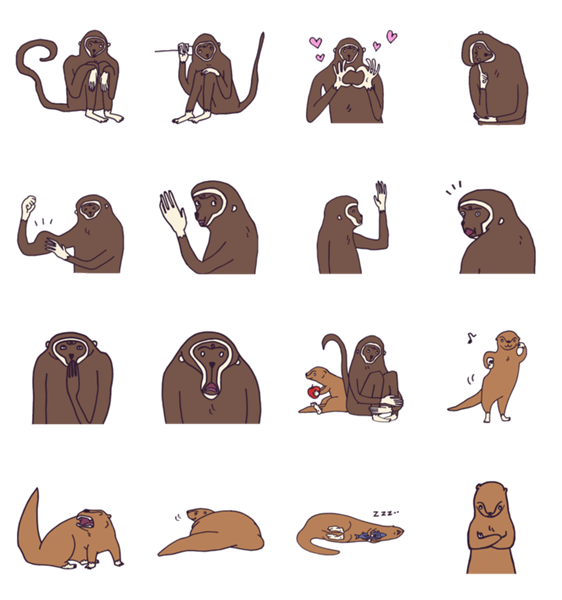 テナガザルとお茶目なカワウソのユニークな組み合わせ。 たまに見せるちょっとした表情スタンプ