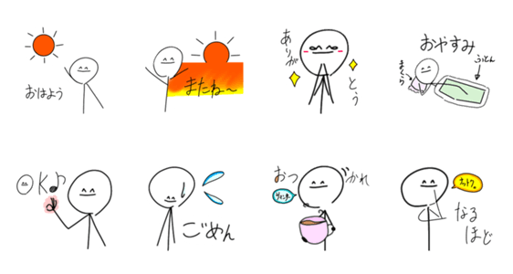 ニコニコしている棒人間のシンプルで使いやすい日常スタンプです。ニコぼ〜というのは「ニコニコぼ〜にんげん」という私の適当なキャラクターの略です。