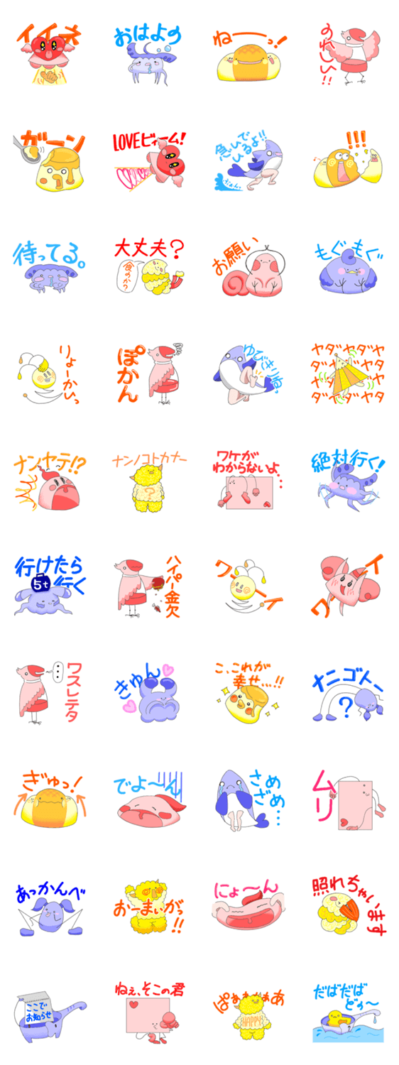 | スタンプ説明 | サメ、ハシビロコウ、クラゲなどなど...いろいろなものをモチーフにしたクリーチャー達がわちゃわちゃしているスタンプです。 |