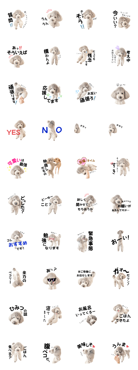犬の写真スタンプ。シルバートイプードルの元気で甘えん坊な男の子です。時々仲良し家族犬も登場。是非シリーズでお楽しみください!ちょっとした一言に便利なセットです